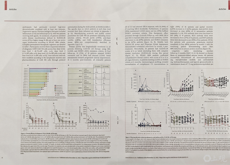 新民晚报记者获悉,该研究在2023年2月启动,历时两年半,共入组18例复发难治性中重度活动期SLE患者——首位患者在2023年8月入组,2024年6月完成最后一例患者入组。论文通讯作者赵东宝透露,中位随访超9个月,最长随访达18个月。结果显示:随访超过1年的9例患者中,三分之二患者实现完全缓解或狼疮低疾病活动度,且无一例复发;治疗后患者体内免疫功能得到调整,为长期缓解奠定基础。